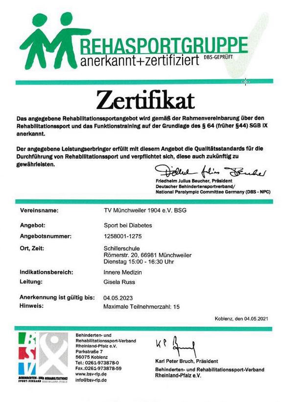 Zwar können auch Diabetiker nicht uneingeschränkt Sport machen, sicheres und unbeschwertes Training ist aber bei intensiver Kontrolle von Blutzucker durchaus möglich. Da es vielen schwer fällt, sich allein zu regelmäßiger körperlicher Aktivität aufzuraffen, bietet der Turnverein Münchweiler eine Diabetessportgruppe an.